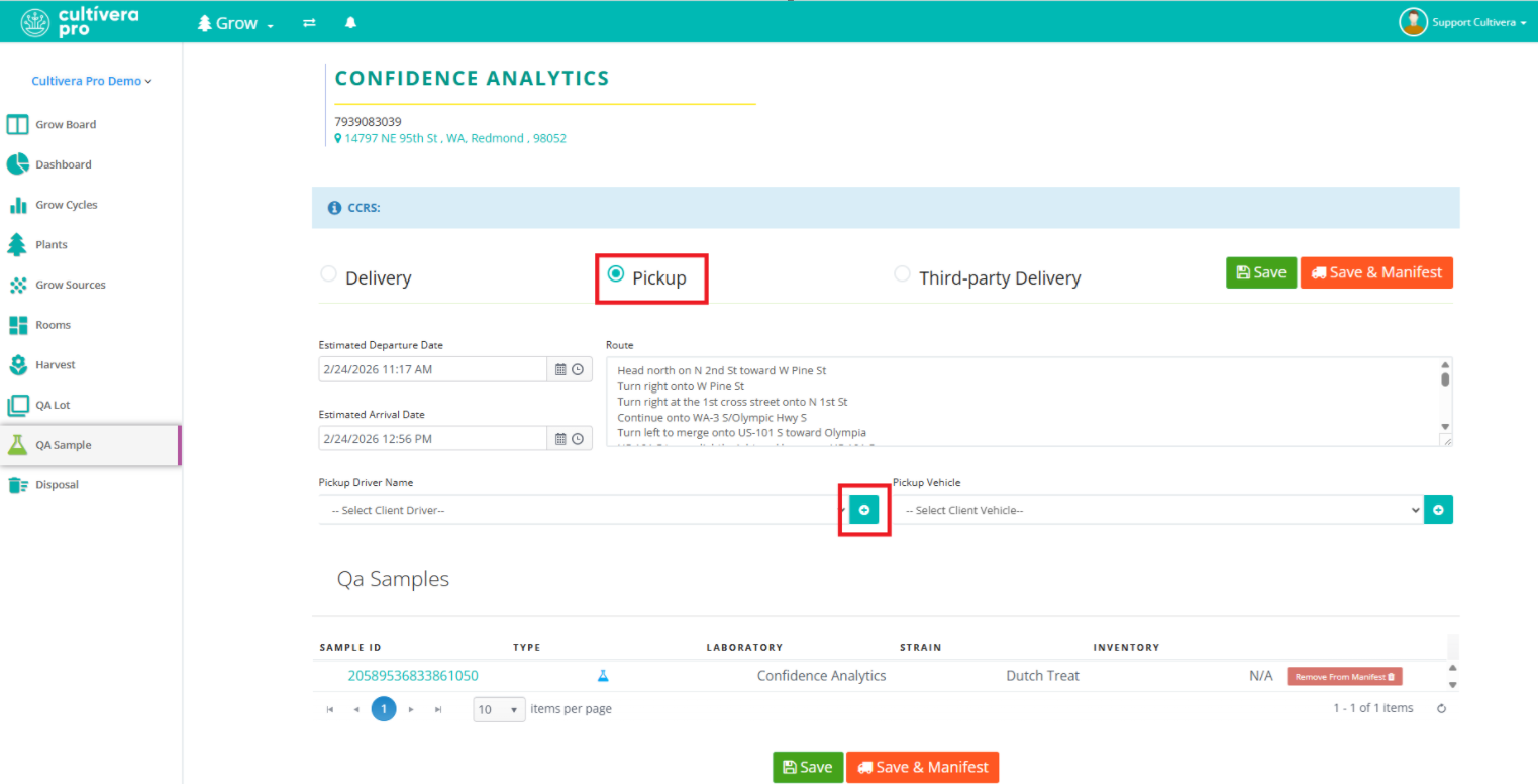 - On the "Manifest" page, determine whether it will be for Delivery, Pickup, or will use a Third-Party Delivery service. The Estimated Departure and Arrival Dates need to be in the future, and the Route should fill in automatically, based on the addresses listed.