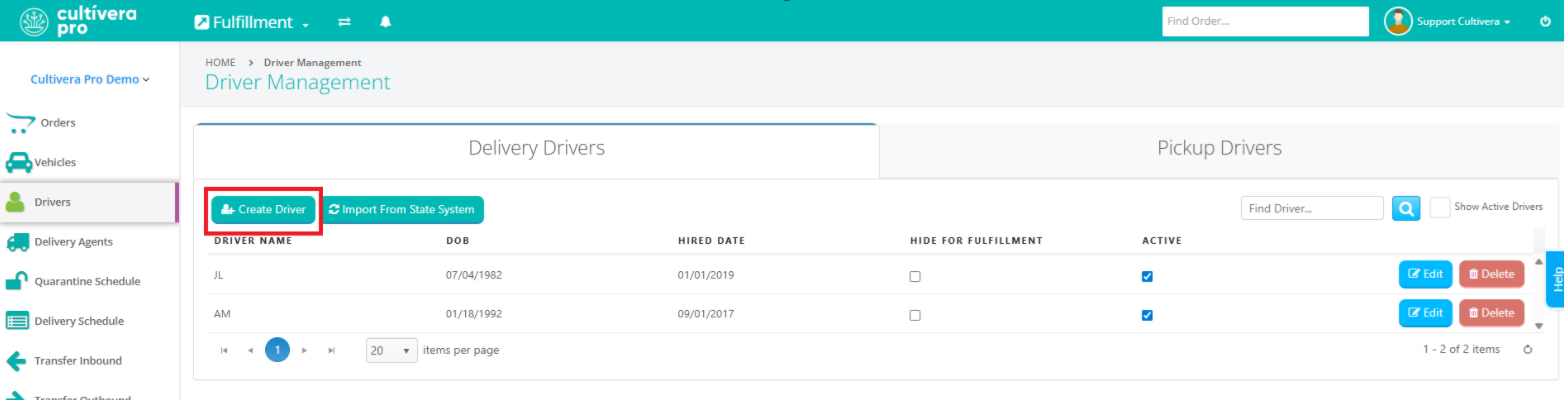 - Click the "Manage Drivers" link to navigate to the Fulfillment > Drivers screen, where you can create, edit, and/or delete drivers.