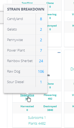 Once rooms have plant information associated with them you’ll be able to hover your mouse pointer over the totals to see a breakdown of how many plants of each strain are in the room. In the example below, the mouse pointer is hovering over the Vegetative count and the pop up “strain breakdown” shows the count of each strain in the room.
