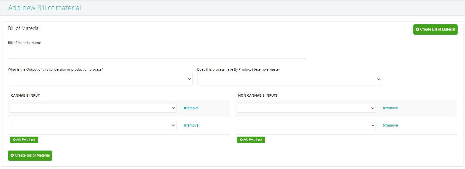- In the second dropdown field select the input product type(s) from the dropdown menu. You can add as many inputs as you need by clicking “+ Add More Input”.It’s a good idea to remove any empty fields that are not in use by clicking the "remove" link.