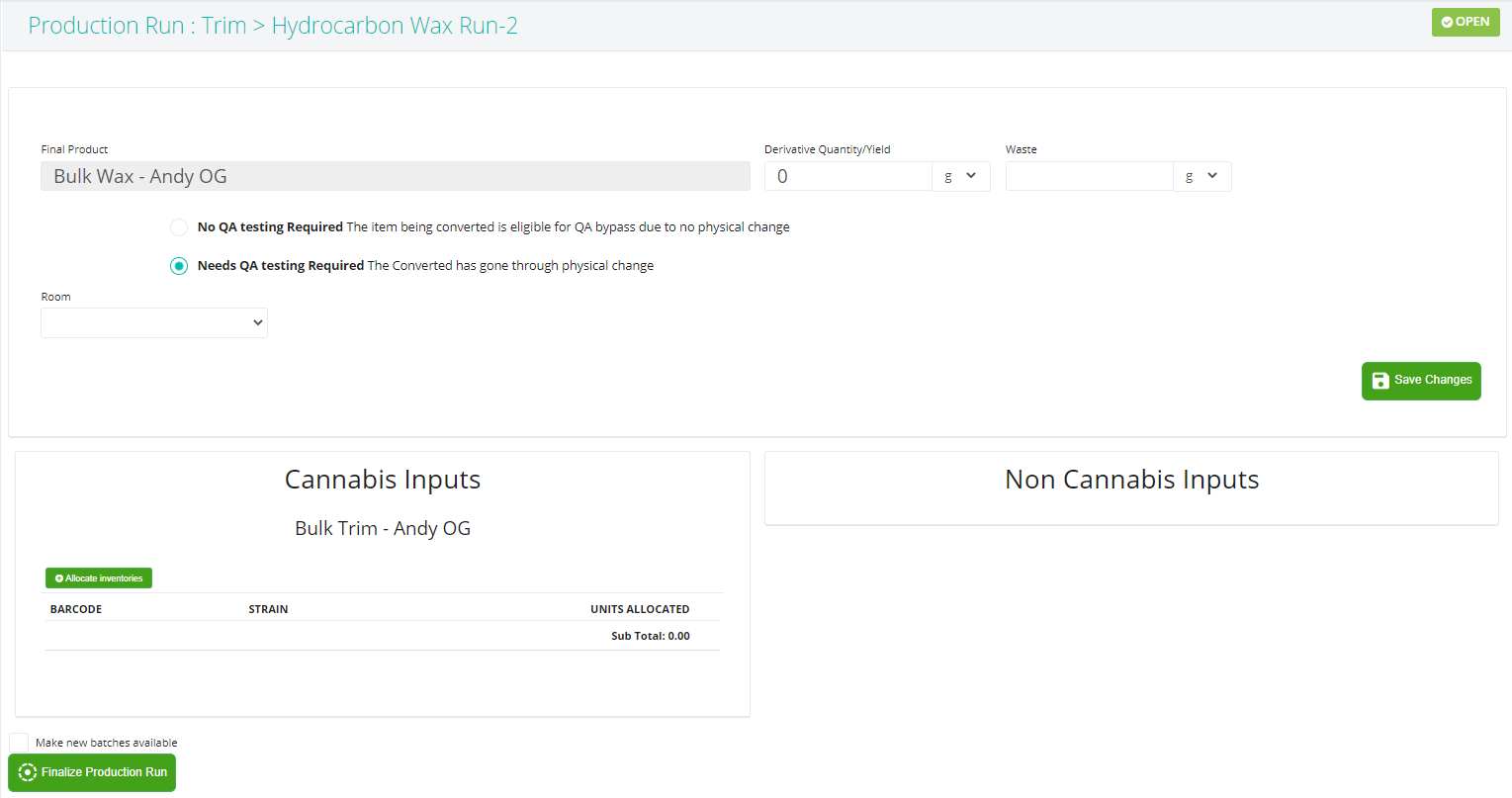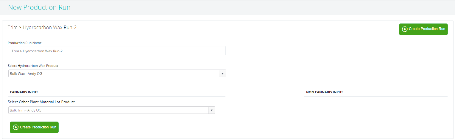 - The New Production Run screen is where you’ll enter the specific output product and input product you’re working with.It is helpful to name the production run after the finished product you’re making, with specific strain and size information, so it can be found easily later in case you want to do a “Re-run” of the same product.The Products you’re able to select from the dropdown menu are limited by the inventory types listed in the Bill of Materials. When selecting your output and input products it can be helpful to type part of the strain or product name to narrow down the list. Remember the output is what you are making and the input is the source material you are making it out of.