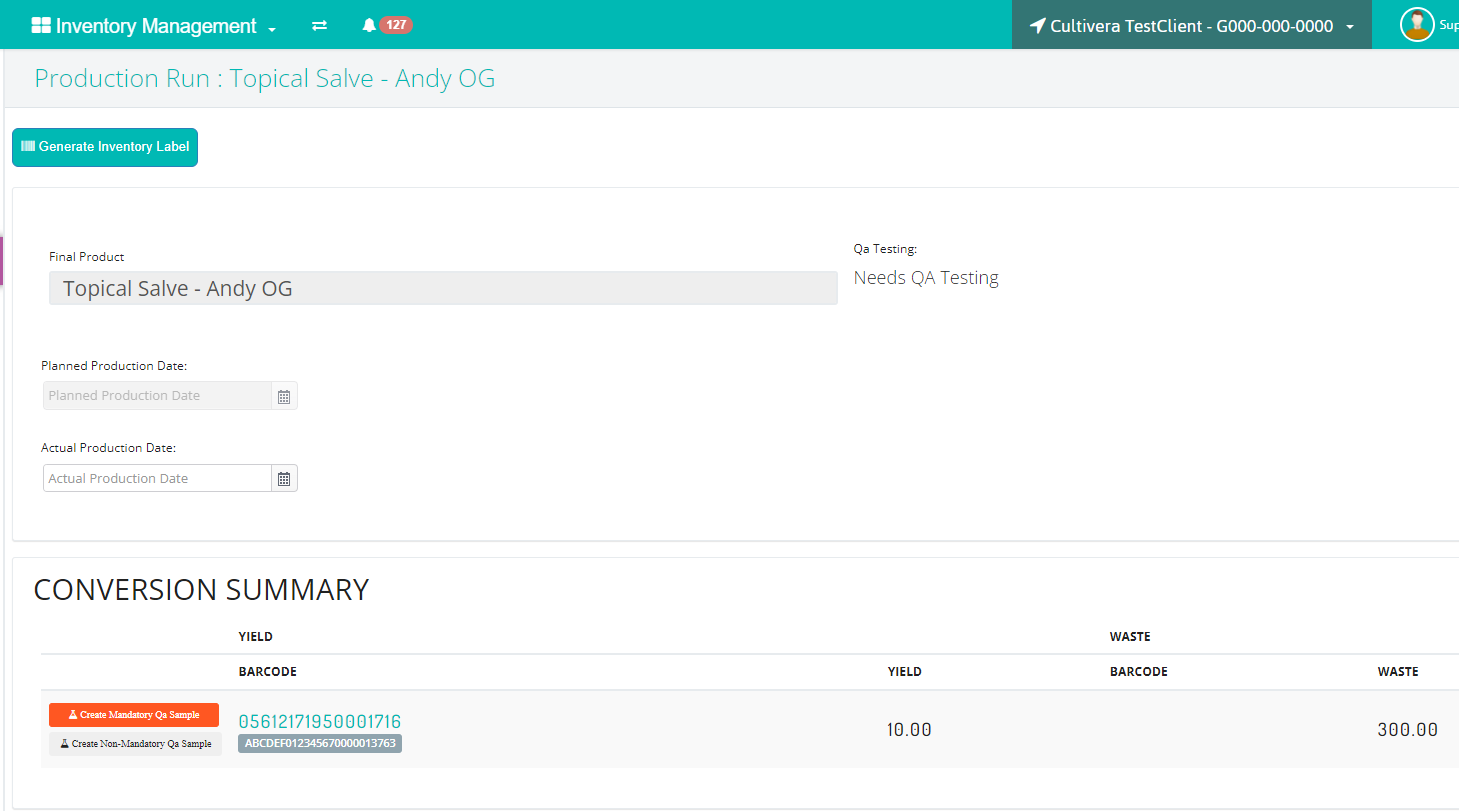 Use the "Generate Inventory Label" button at the upper left of the screen to create an inventory label for the completed batch so it can be tracked in your warehouse.