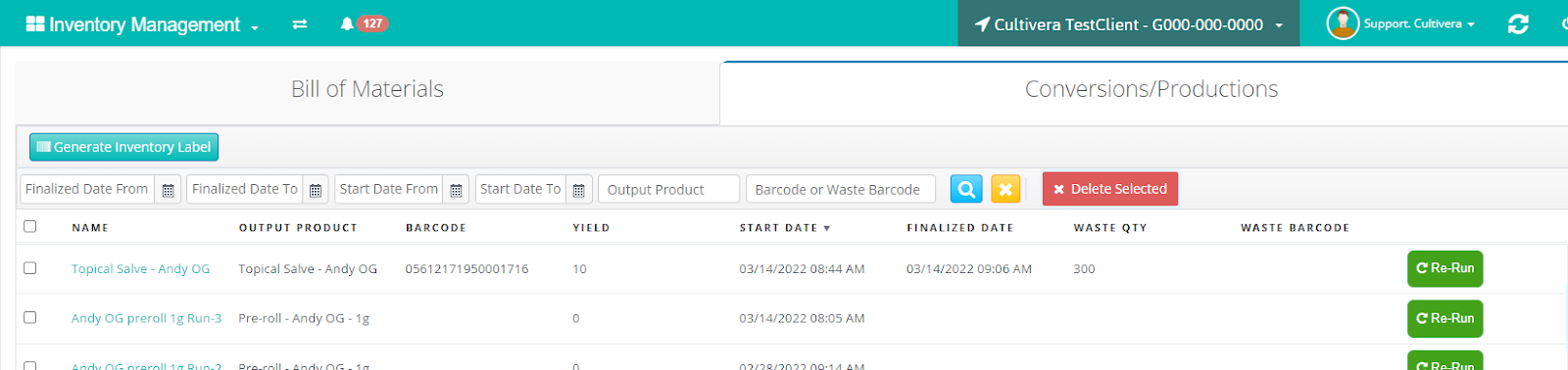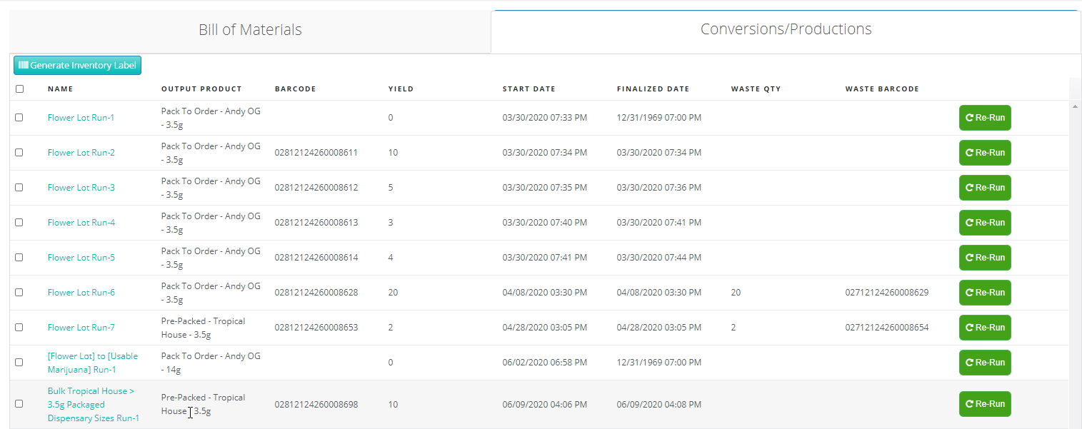 Details about your run can now be found on the “Conversions/Productions” tab at the upper right of the main Productions page. This is where you can generate inventory labels for output products and do “re-runs” of any previous production runs using the green “Re-Run” buttons on the right.