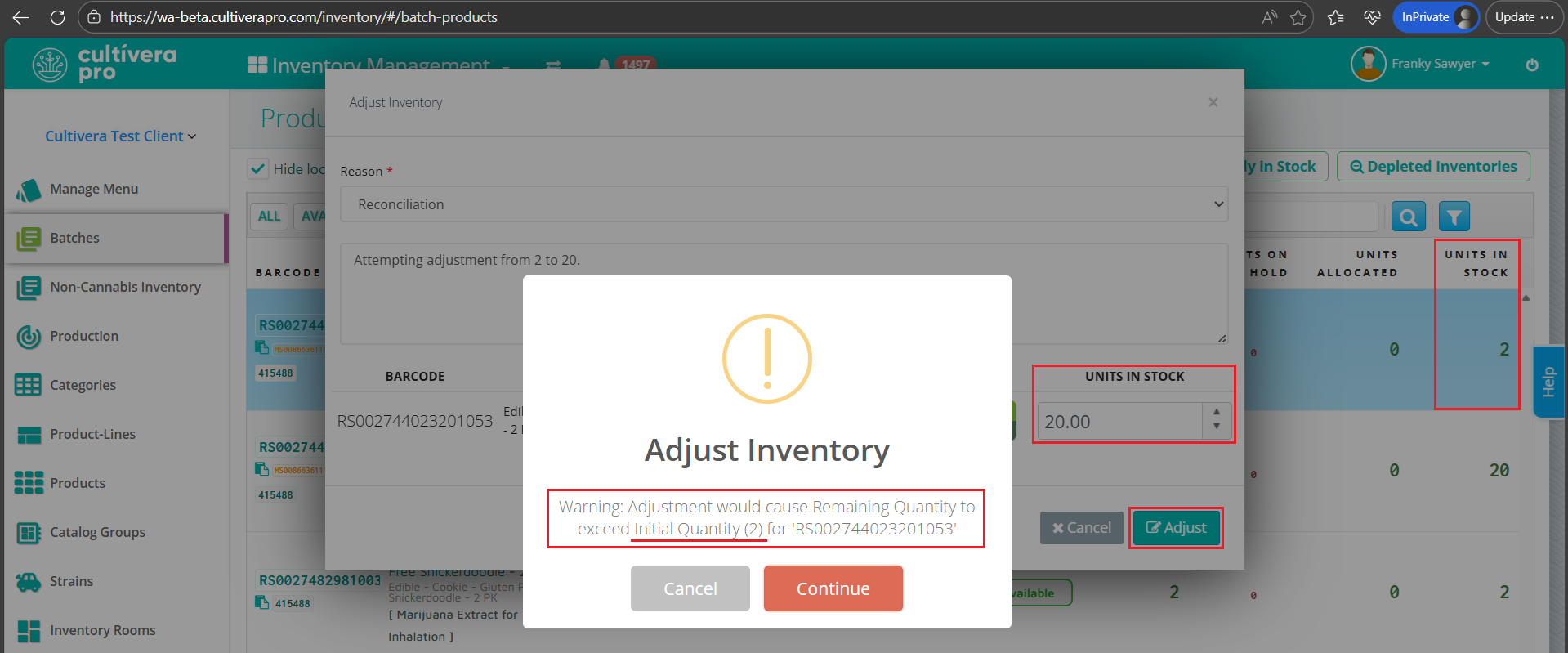- The warning will mention the "Initial Quantity" for the selected Batch(es), which will not always match the current quantity, but is instead the quantity that batch started with when inbounded, sublotted, or outputted from a harvest or conversion/production run.