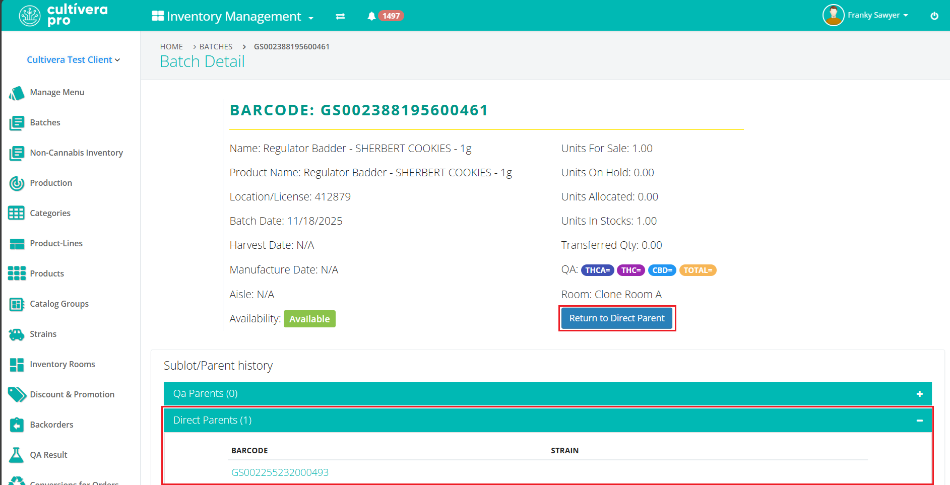 - Inventory Management > Batch Detail: A "Return to Direct Parent" feature has been added, which automates adjustments of the remaining units of that batch back into the direct parent: