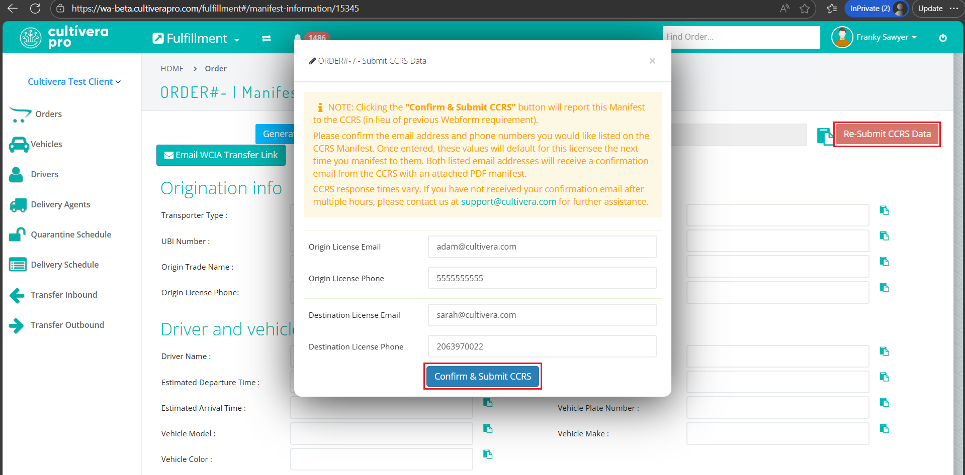 If you don't receive a "Manifest Generated" email within 15-60 minutes of manifesting, please navigate to the corresponding "View Manifest Information" page to press "Re-Submit CCRS Data", then email support@cultivera.com to let us know so that we can double-check for any potential error responses (please be sure to include a mention of either the Order# or Manifest ID).