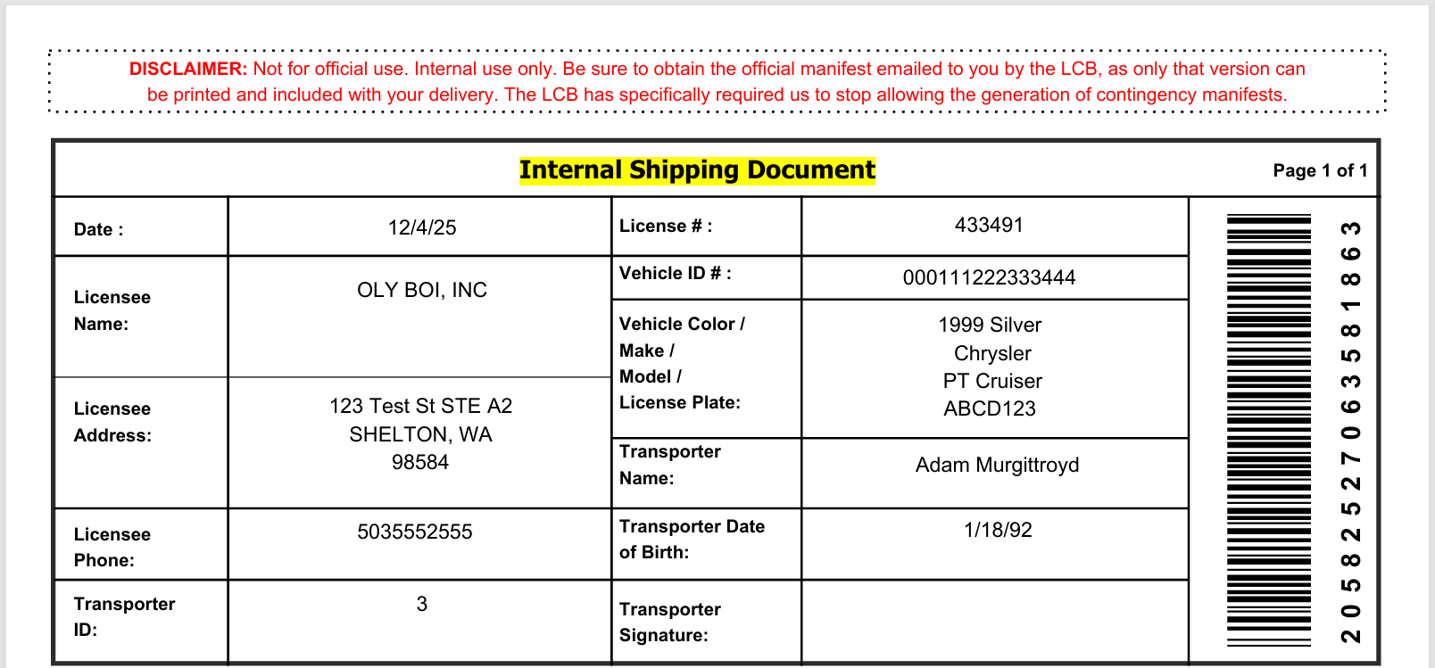DISCLAIMER: Not for official use. Internal use only. Be sure to obtain the official manifest emailed to you by the LCB, as only that version can be printed and included with your delivery. The LCB has specifically required us to stop allowing the generation of contingency manifests.