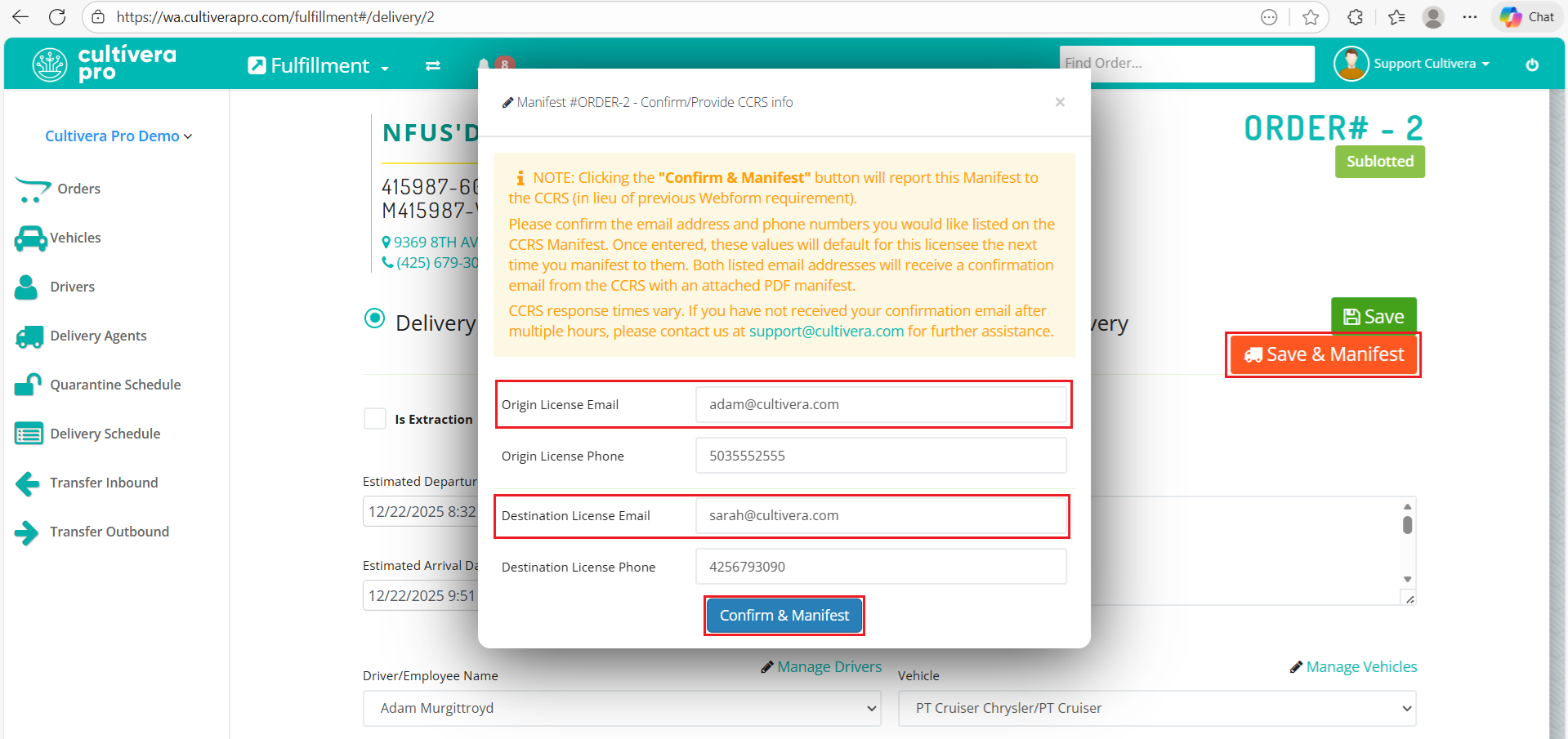 Instead, you should manually retrieve the CCRS Manifest PDF attached to the corresponding "Manifest Generated" email; this is the only manifest document that should be printed and on-hand during transportation (please note: these can't be retrieved directly from Cultivera currently):