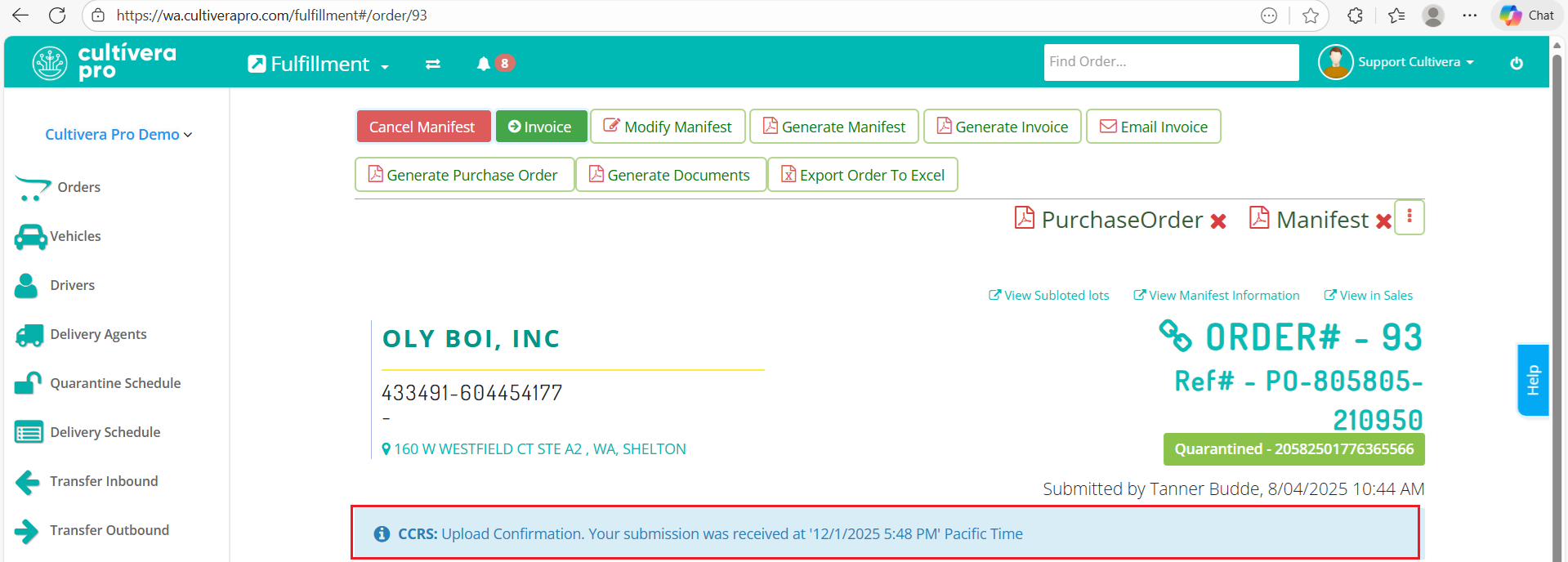 - Once you see this message, that confirms the CCRS and LCB have a record of the manifest, and the corresponding "Manifest Generated" email will now be in the Origin and Destination Emails entered when manifesting.