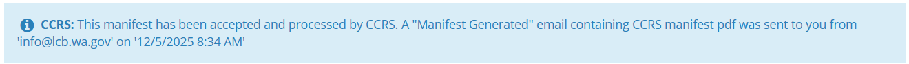 CCRS: This manifest has been accepted and processed by CCRS. A "Manifest Generated" email containing CCRS manifest pdf was sent to you from 'info@lcb.wa.gov' on '12/5/2025 8:34 AM'