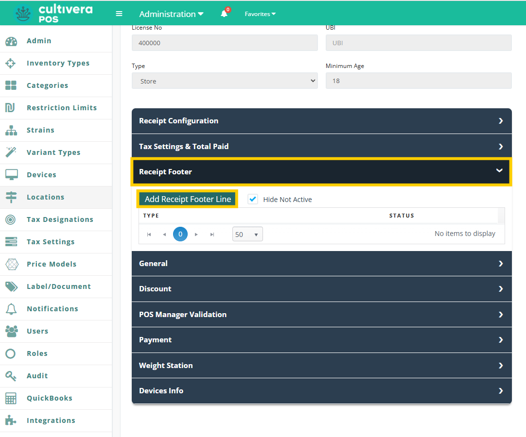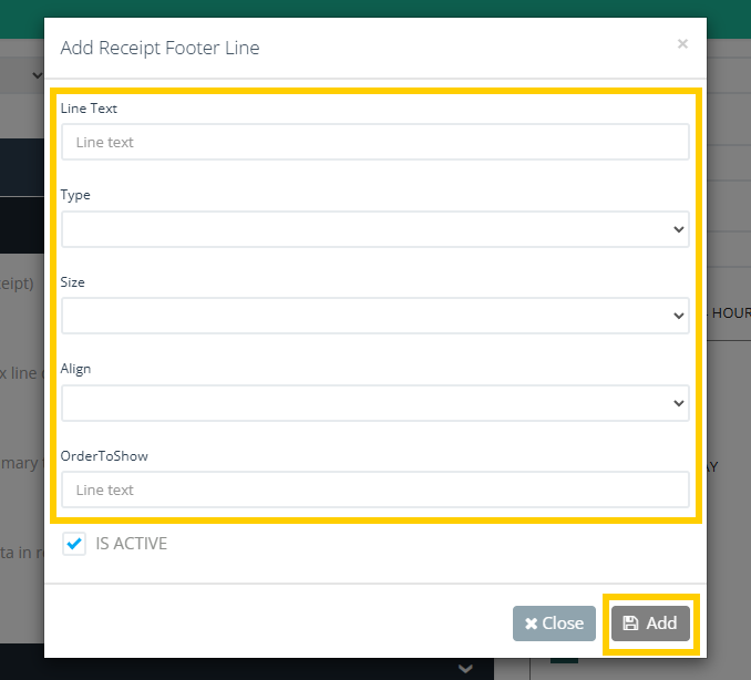 - Scroll down and select "Receipt Footer" > "Add Receipt Footer Line".