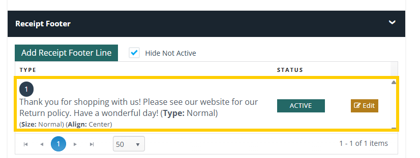- You will then see your newly created footer displayed under "Receipt Footer".