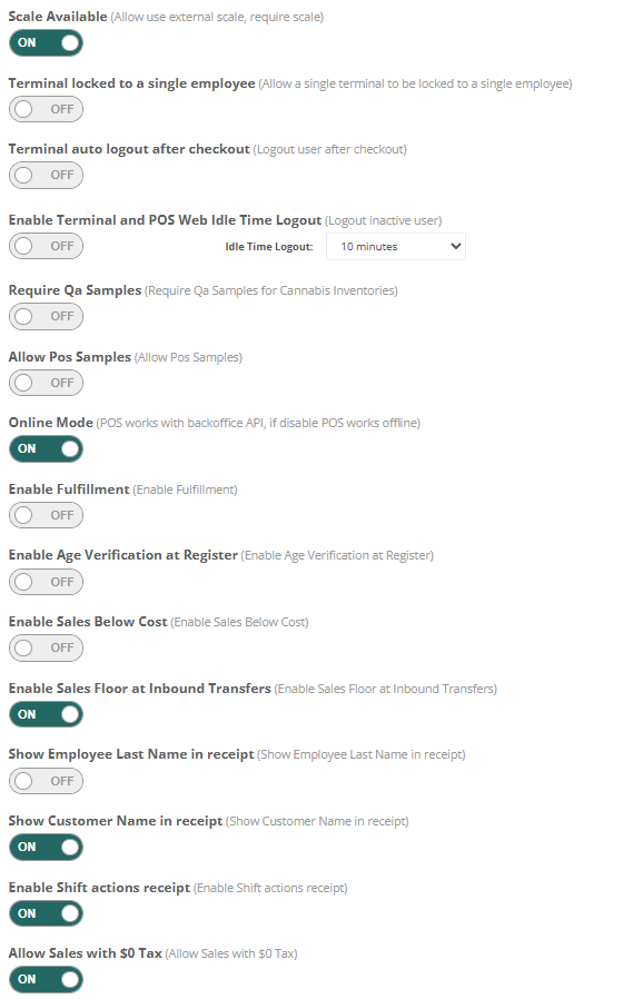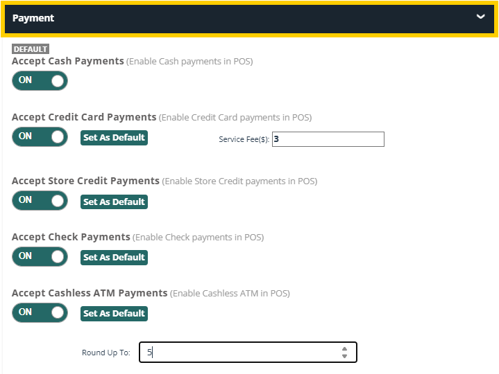 The Payment toggles will reflect what payment types will be available to select when processing a transaction at the terminal.
