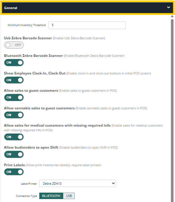 The General section features various toggles and input fields that control core operational behaviors and preferences. You can toggle these settings ON or OFF depending on the needs of your business.