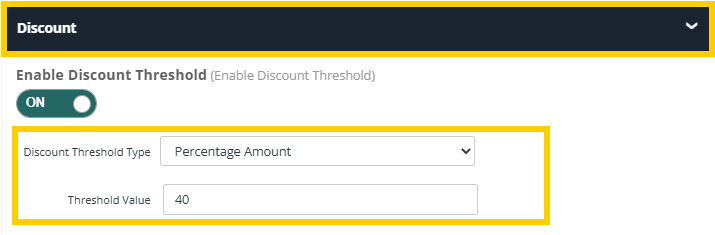 When toggled ON, the Discount Threshold controls the maximum discount that can be applied, preventing any discounts from exceeding the set limit. This can be configured as a Percentage amount or a Dollar Value amount.