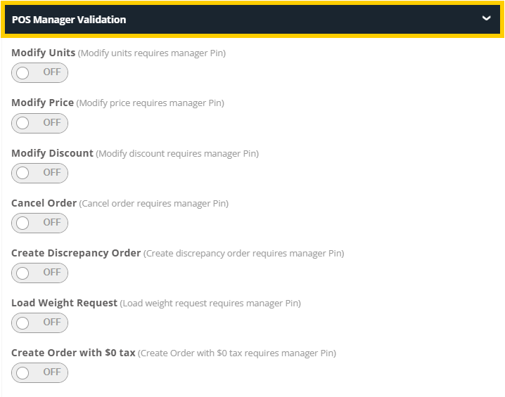 When toggled ON, the POS Manager Validation feature will require a Manager's PIN for approval whenever the specified function is being performed at the terminal.