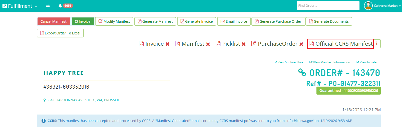The Official CCRS Manifest will be generated on the Fulfillment > Order Details page once it has been successfully processed.