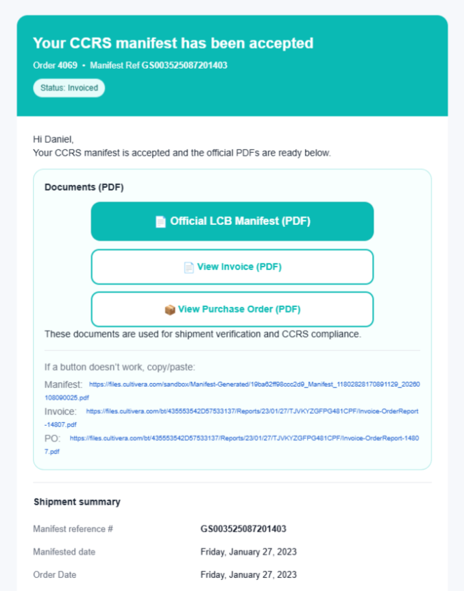 You should still receive the expected CCRS "Manifest Generated" email to the 'Origin License' and 'Destination License' email that was input at the time of manifesting the transfer in Cultivera, but this will now surface in Cultivera as well.