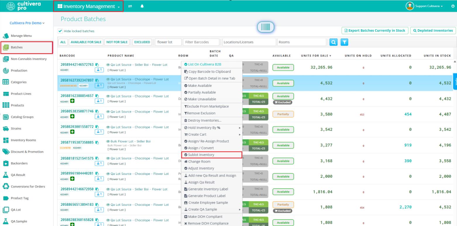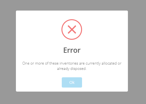"Destroy Inventories"Error:One or more of these inventories are currently allocated or already disposed.Resolution: You can sublot the batch via Inventory Management > Batches > right-click and select "Sublot Inventory" to give it a new barcode. At that point, you should be able to schedule the sublotted batch for destruction to bypass the error message.