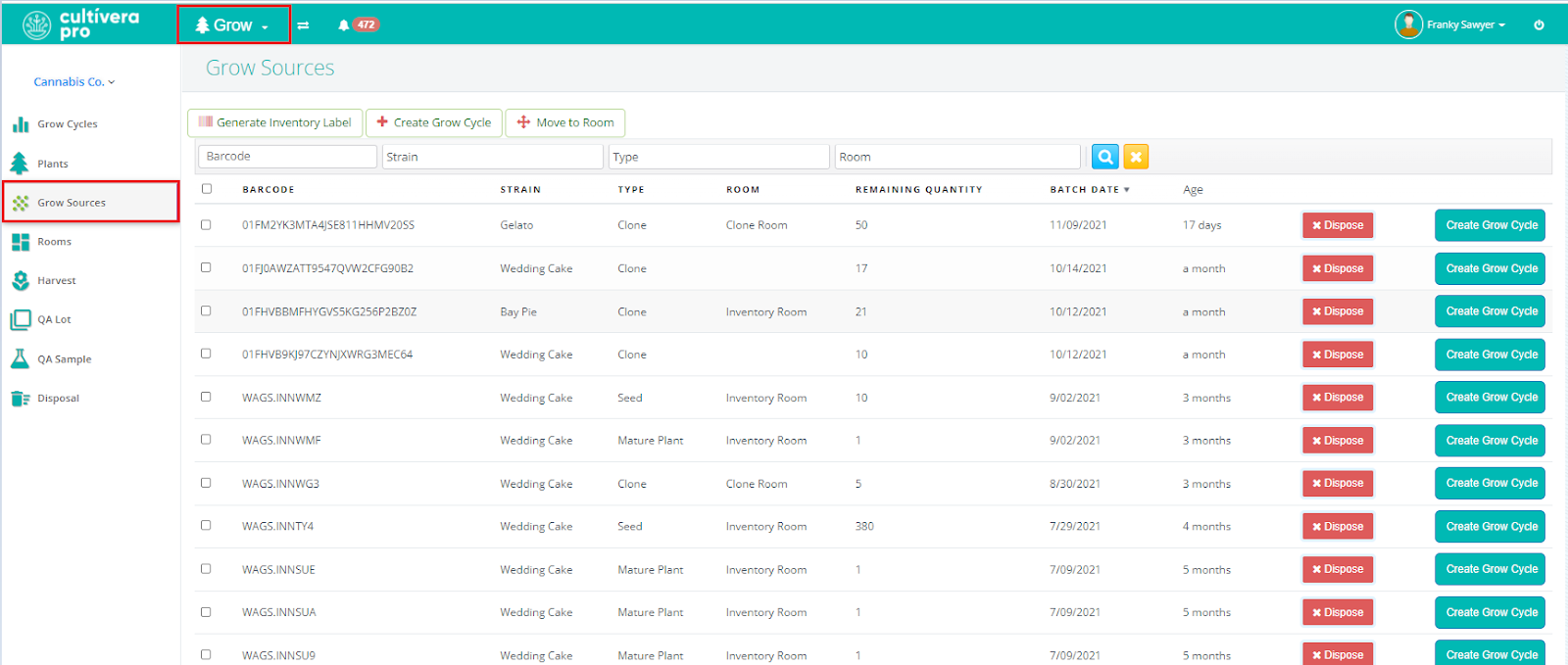 - Navigate to Grow > Grow Sources. These are typically clones or seedlings that are not yet mature. In this step we’re going to “up-pot” them into their 1-gallon pots (or whatever growth medium you’re using to veg in).