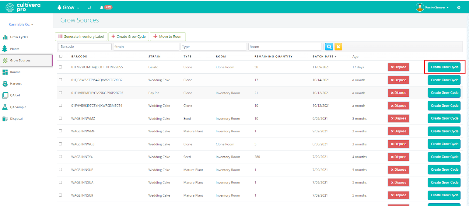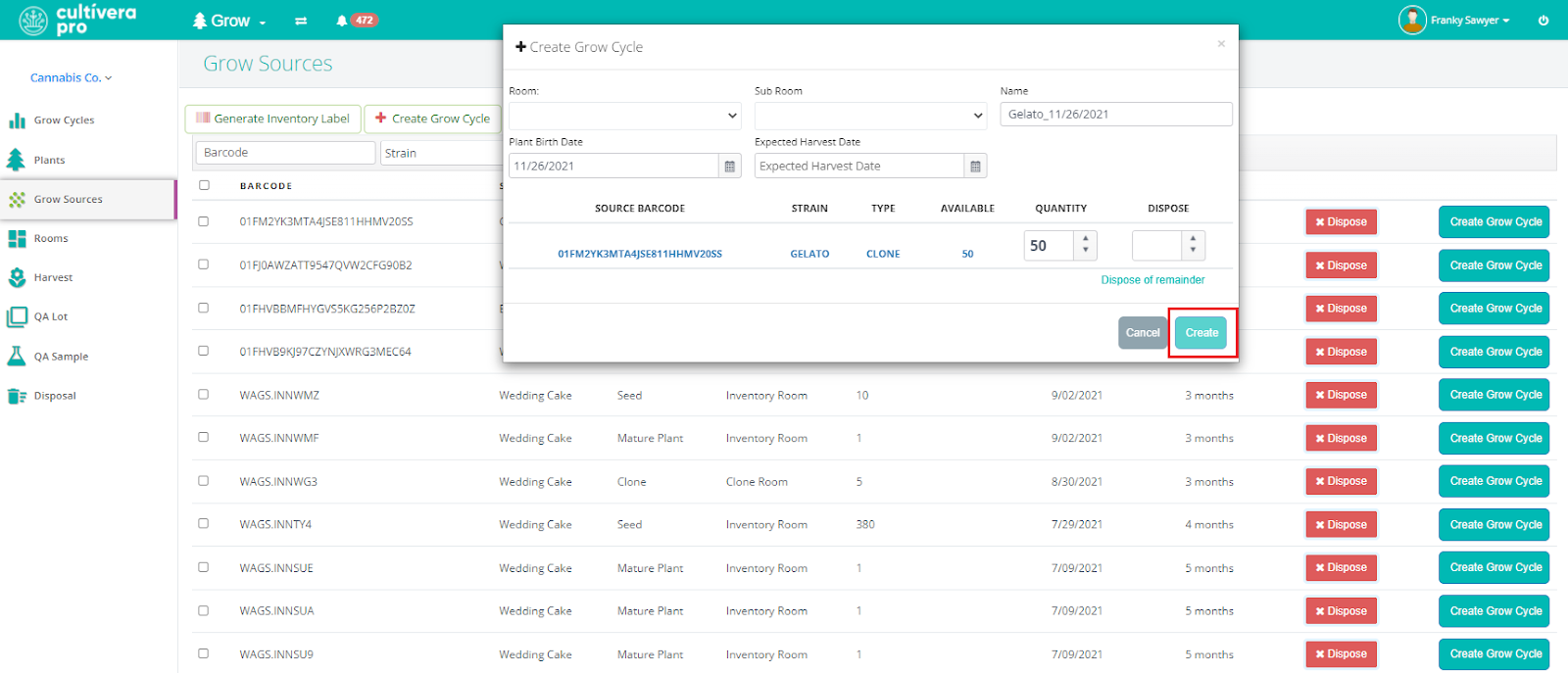 - Select "Create Grow Cycle" to the right of the grow source you wish to create a grow cycle from.