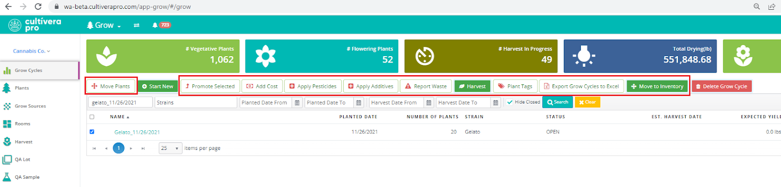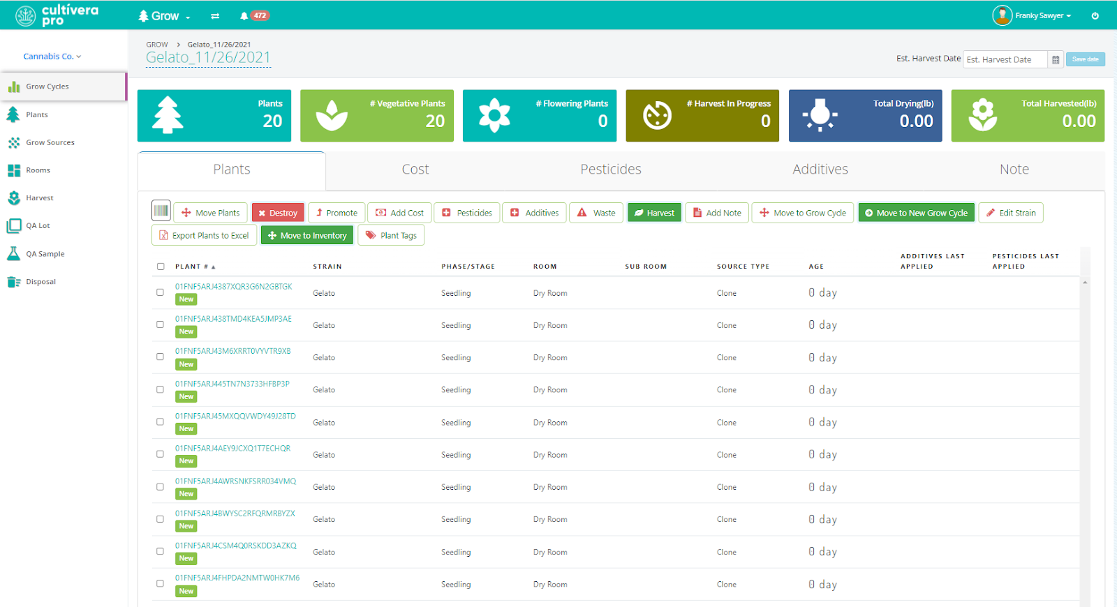 Tip: You can select the checkbox next to a Grow Cycle to perform an action to all of the plants at once using the toolbar buttons. Examples include Promoting Plants, Adding Cost/Pesticide/Additive information, printing Plant Tags, or Moving Plants to a new Room.