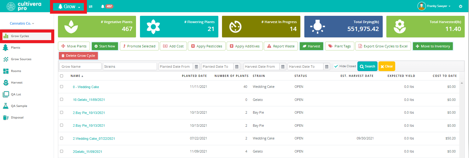 - Navigate to the Grow Cycles page within the Grow Module.