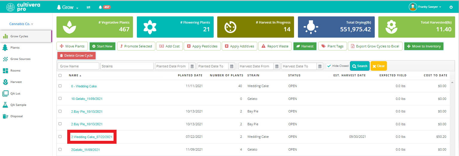 - Click on the Name of the Grow Cycle you’d like to change the name of.