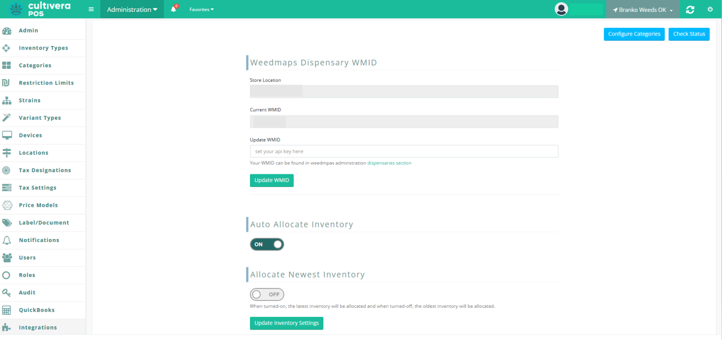 POS - Administration: Integrations - Weedmaps Online Menu