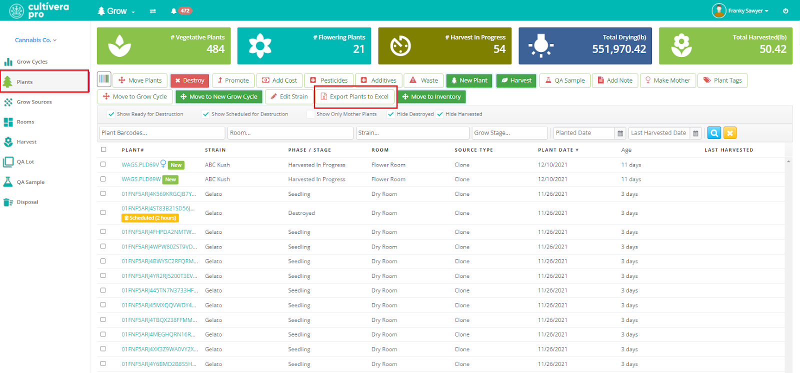 Follow these steps to export an Excel spreadsheet of the active Plants or Grow Cycles in your Cultivera PRO system. These reports cannot be backtracked and should be exported on any given day that you need to have inventory/plant exports for your facility.